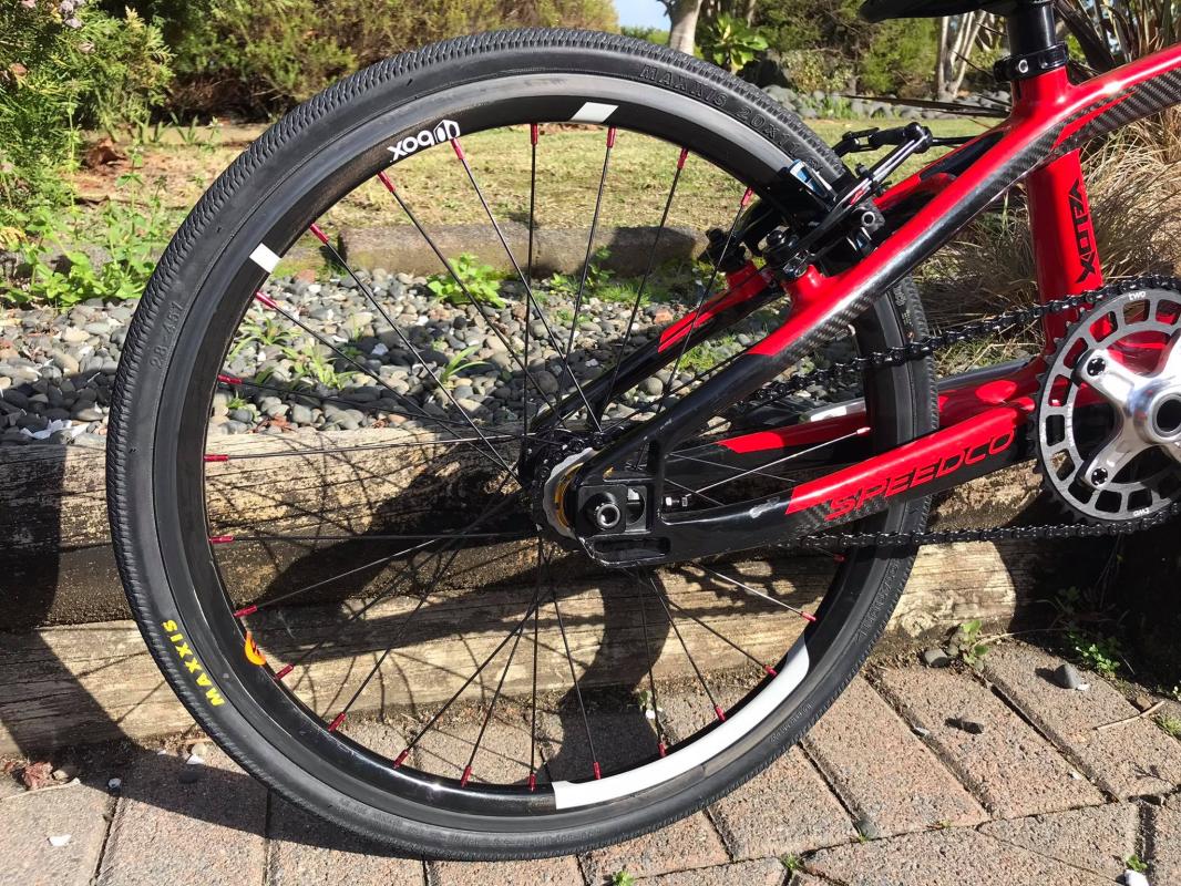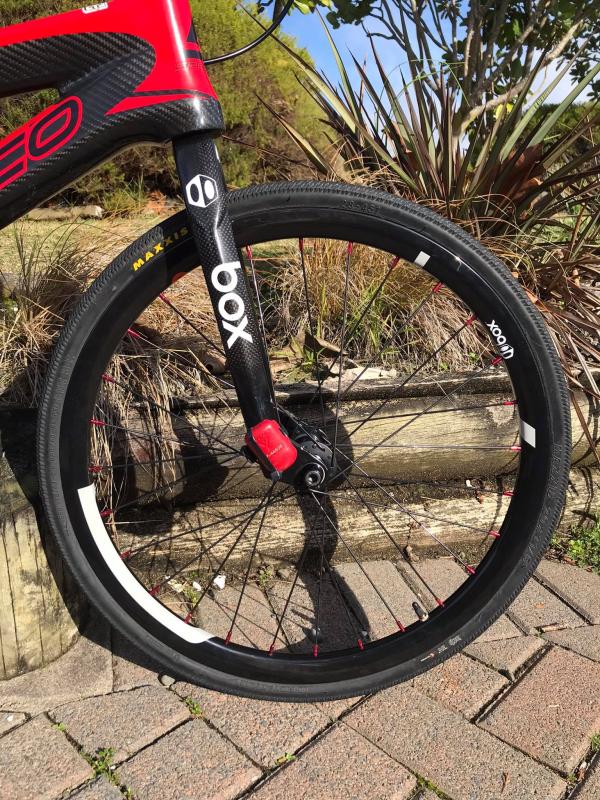 Front Wheel: Box One Carbon Rim 20 x 1 1/8H Rim laced to Box Stealth Boost 28H Hub with stainless steel spokes, alloy nipples (red)