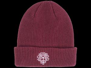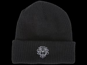 Odyssey - -Monogram Beanie Part of the Winter lineup. White embroidered Monogram logo on a black knit beanie. 8" Cuff Beanie Acrylic Blend Knit